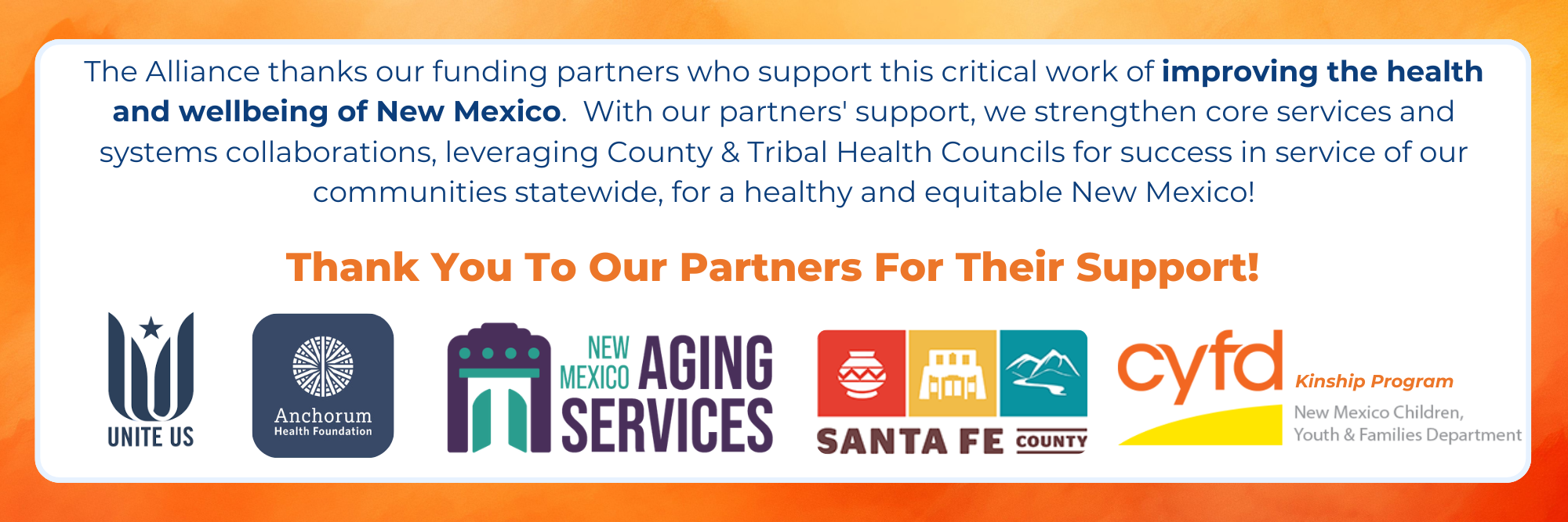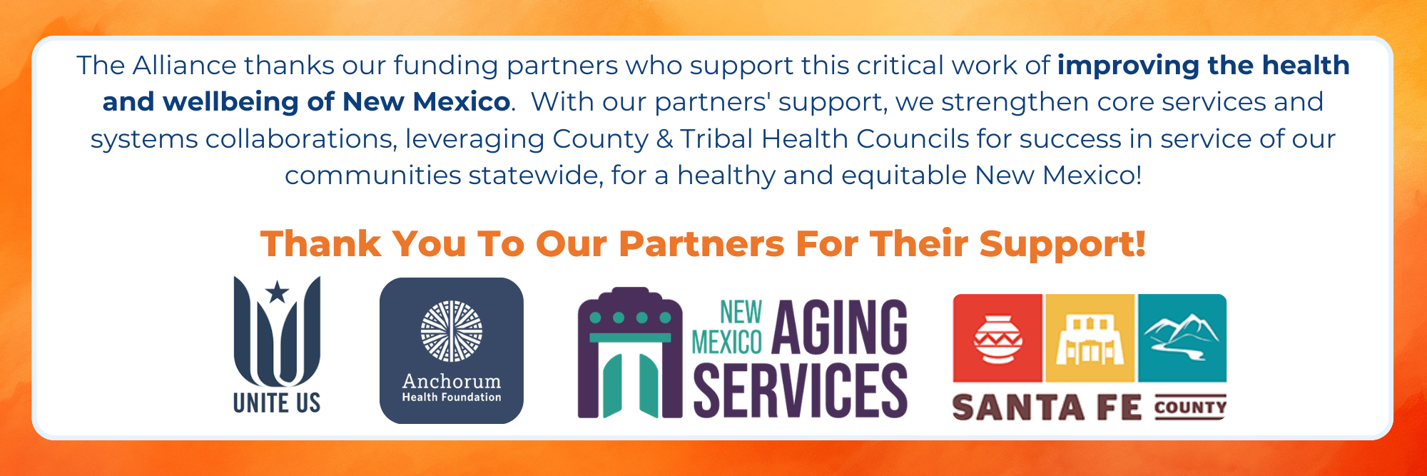 The Alliance fosters collaboration, values equity and inclusion, practices respect, and cultivates a collective voice on community-based priorities and issues that champion a healthier New Mexico.